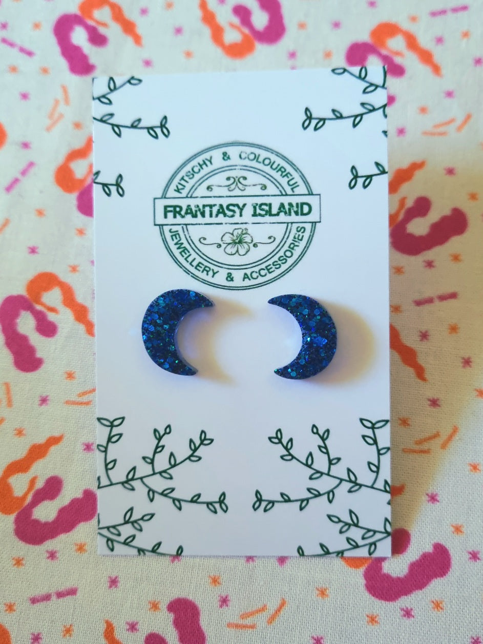 These spectacular stud earrings are a fun crescent moon shape with a deep ocean blue glitter blend set in blue resin - Perfect for any occasion.