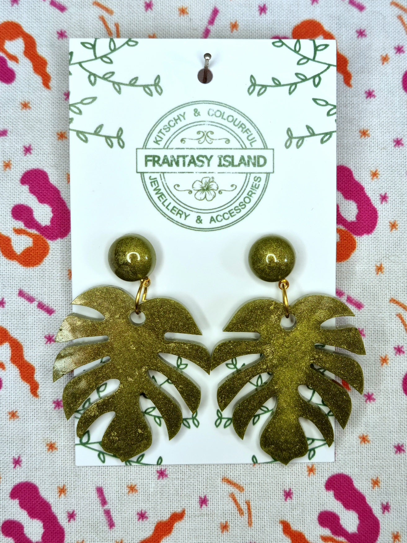 These rich olive green monstera leaf earrings have a blend of shimmering green and gold pigments set in a deep lush green resin - Perfect for any occasion.