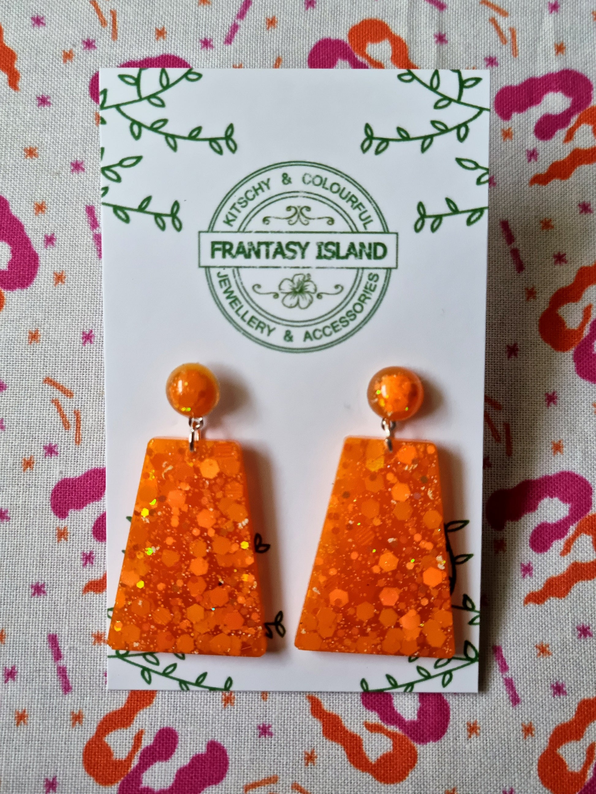 These orange glitter earrings have a classic retro shape, with a chunky holographic glitter blend set in a punchy orange resin - Perfect for any occasion.