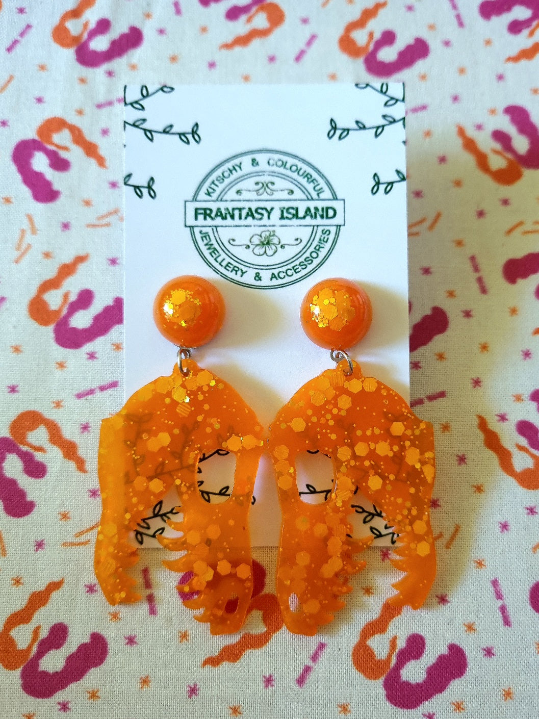 Orange Glitter T-Rex Skull Earrings