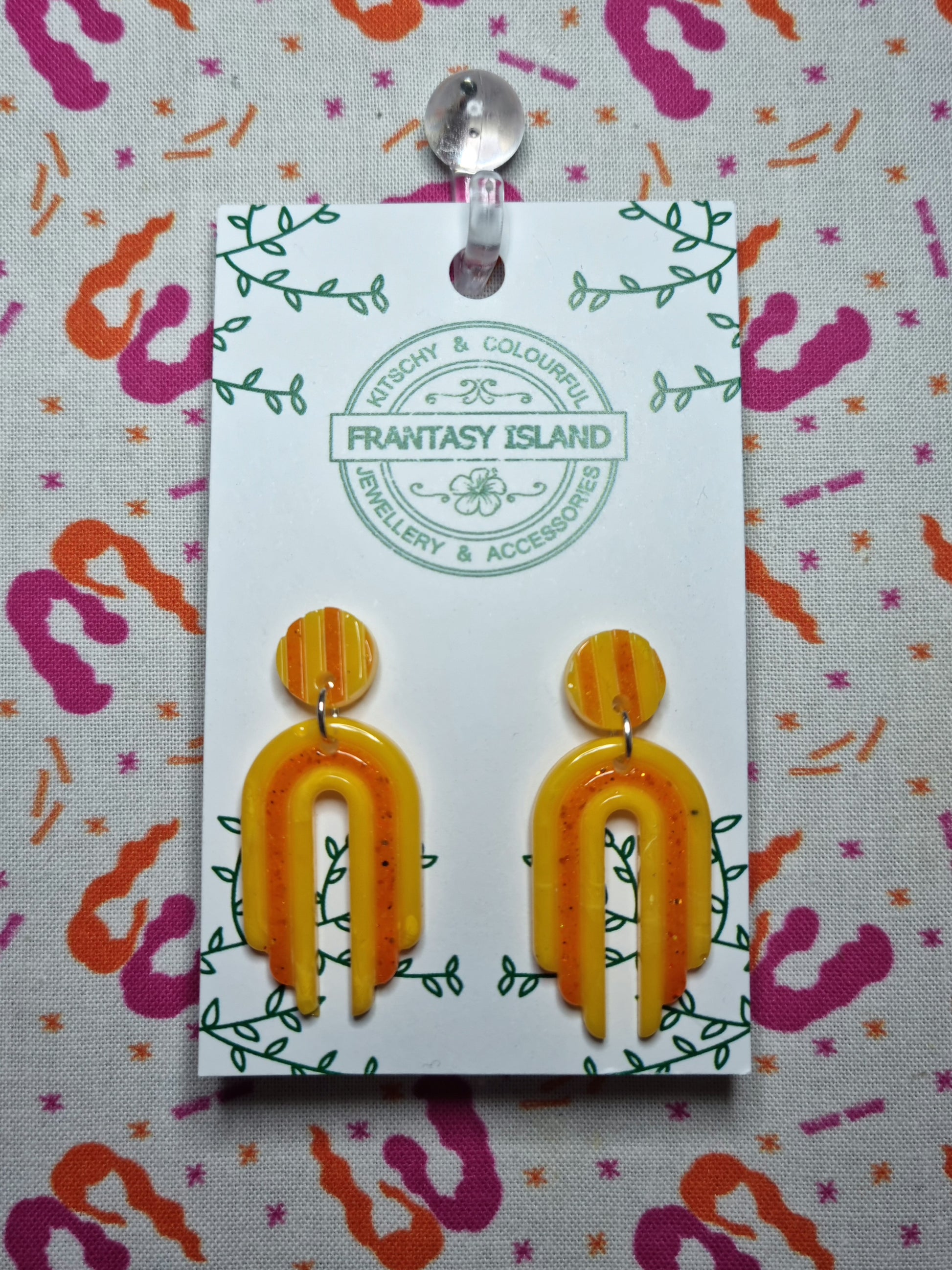 These spectacular drop earrings have a classic retro shape set in orange, and yellow resin - Perfect for any occasion.