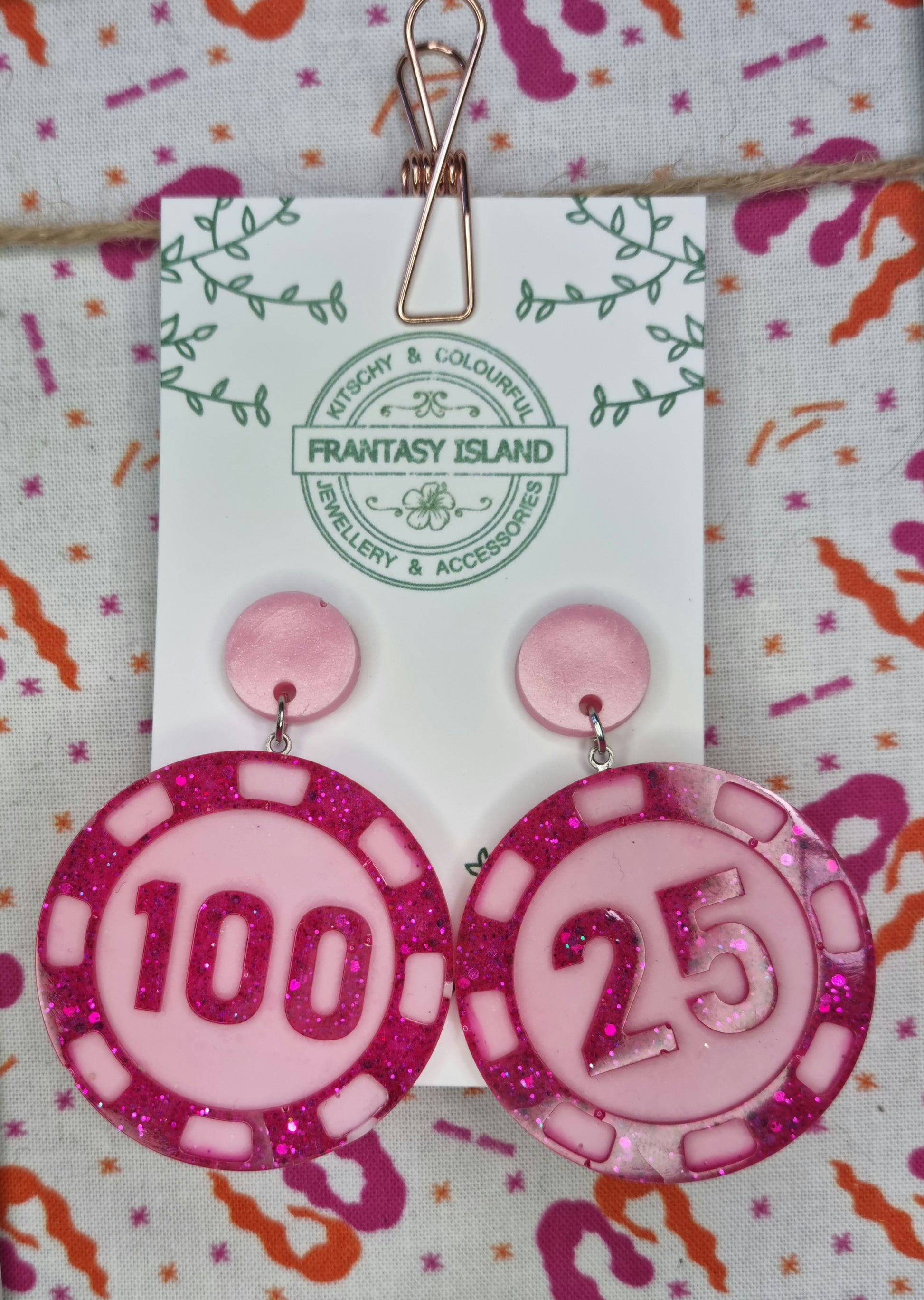 These poker chip drop earrings have hot pink glitter detailing set in pastel pink resin - Perfect for any occasion