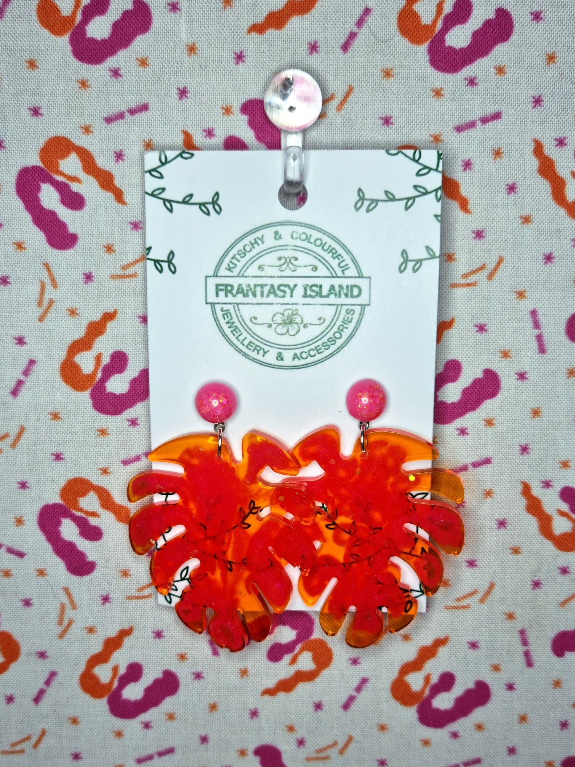 These fresh bright monstera leaf earrings have a blend iridescent glitters set in swirling pink and orange resin - Perfect for any occasion.
