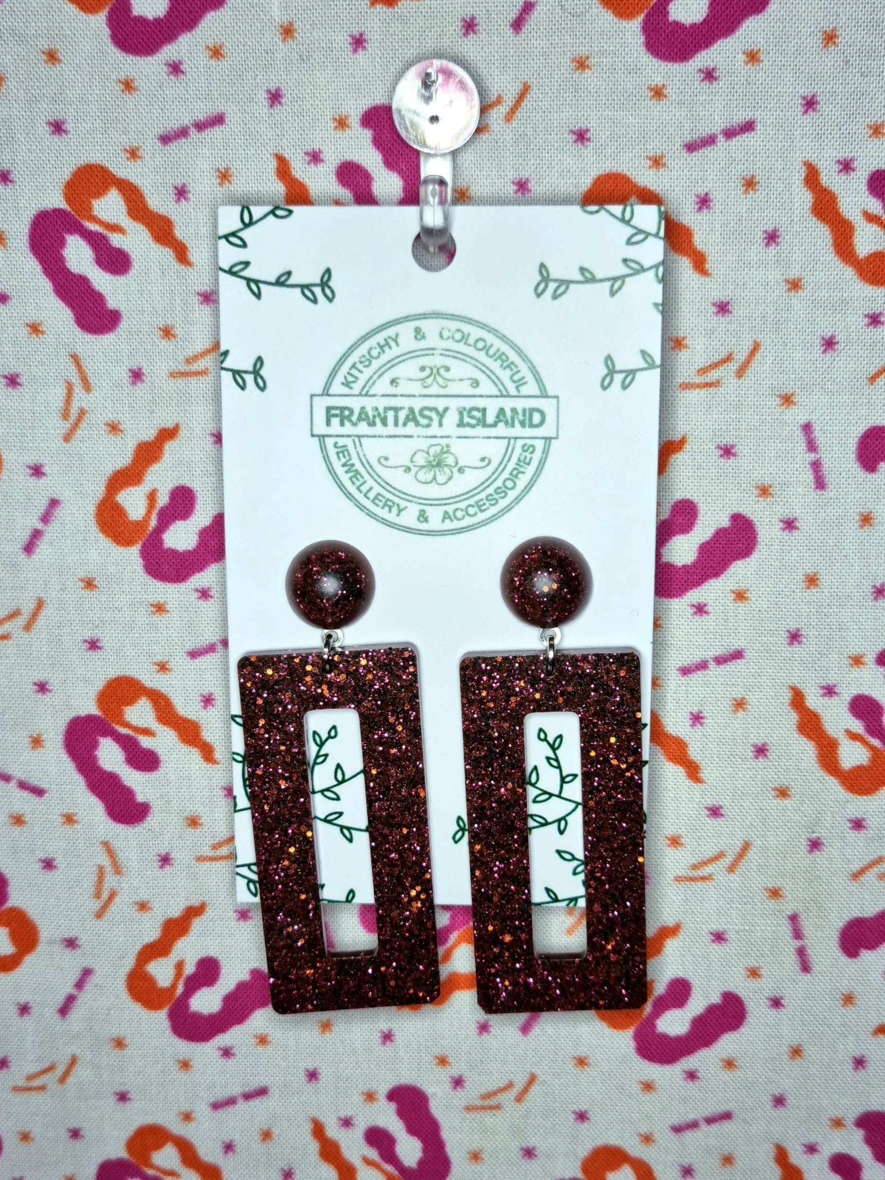 These bold earrings have an exaggerated retro shape, with deep brown and plum glitters set in a warm brown metallic resin - Perfect for any occasion.