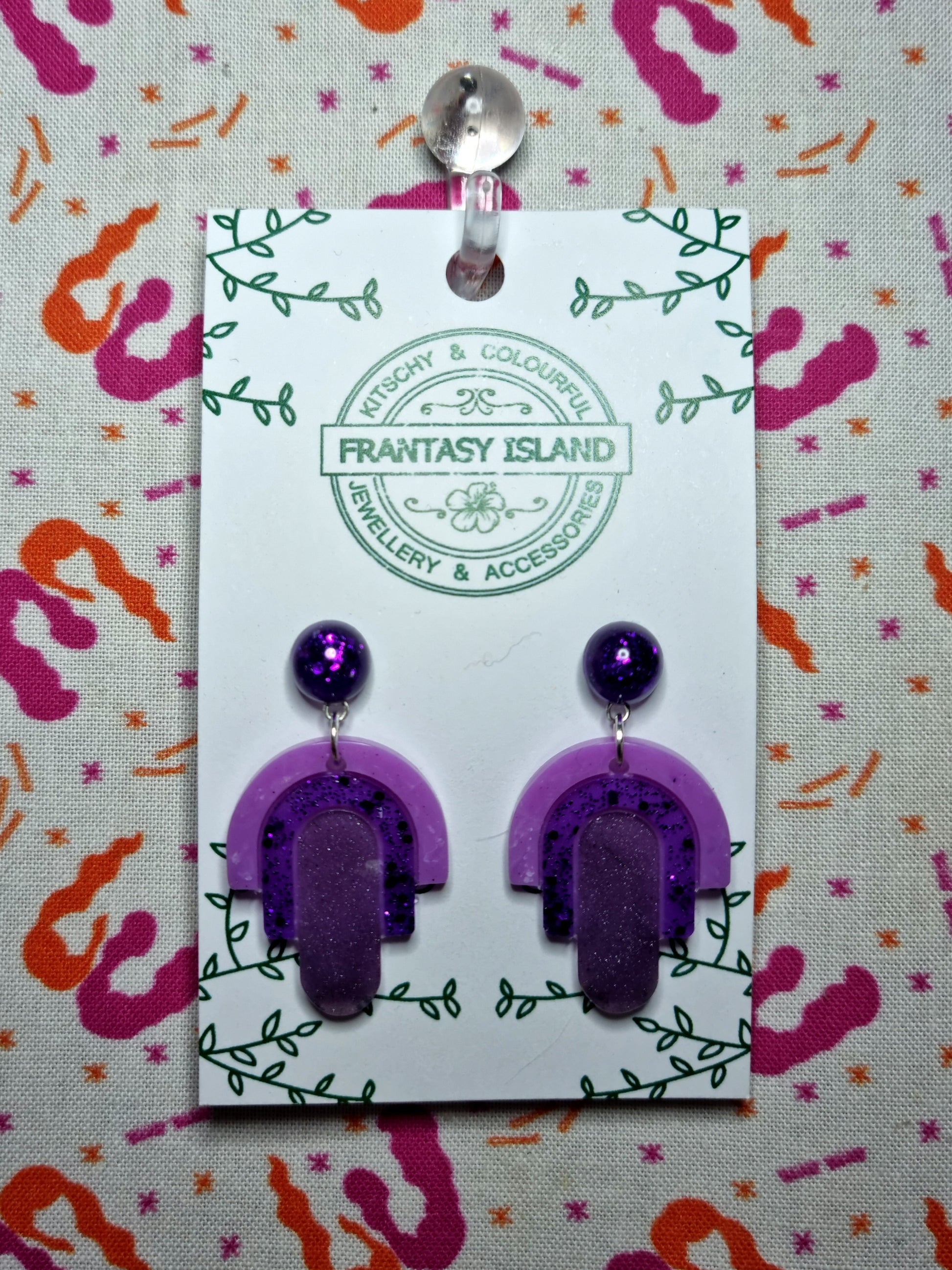These spectacular sparkly drop earrings are about as glitzy as they come, with a classic retro shape and a blend of lilac, purple, and gunmetal metallic pigments set in resin - Perfect for any occasion.