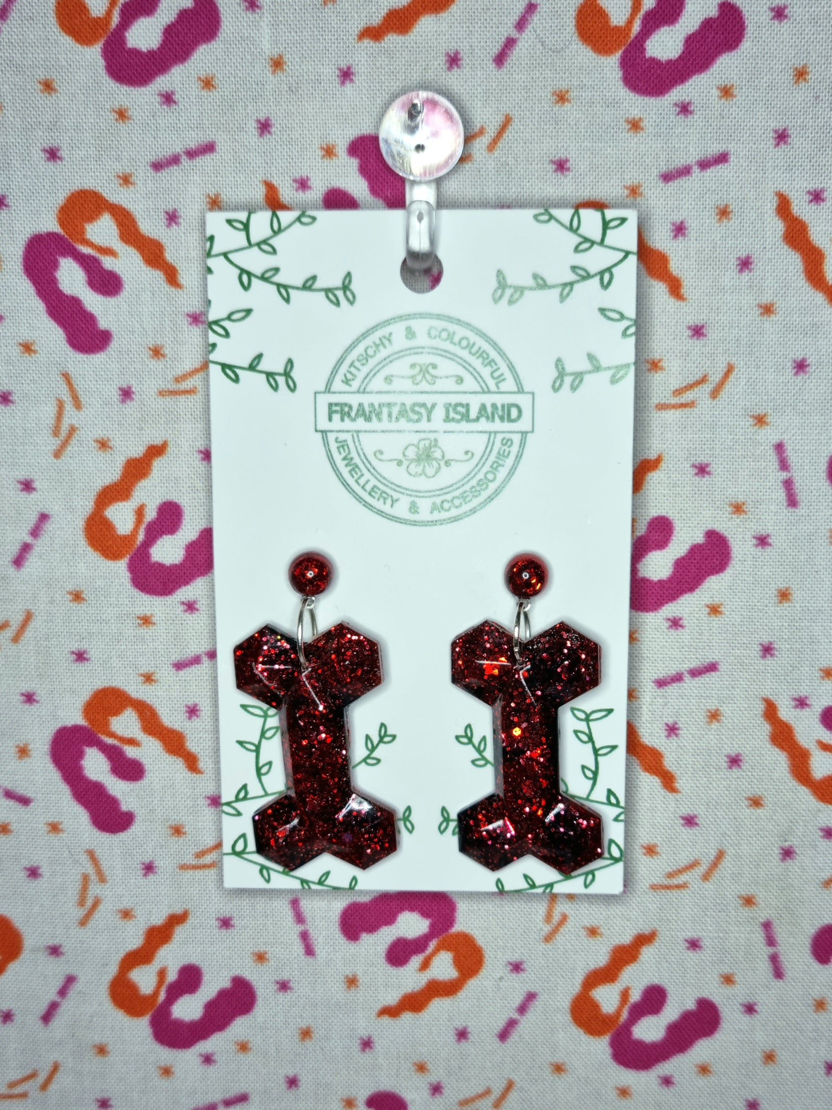 Spooky and spectacular sparkly resin bones, hanging from glossy red glitter domes.