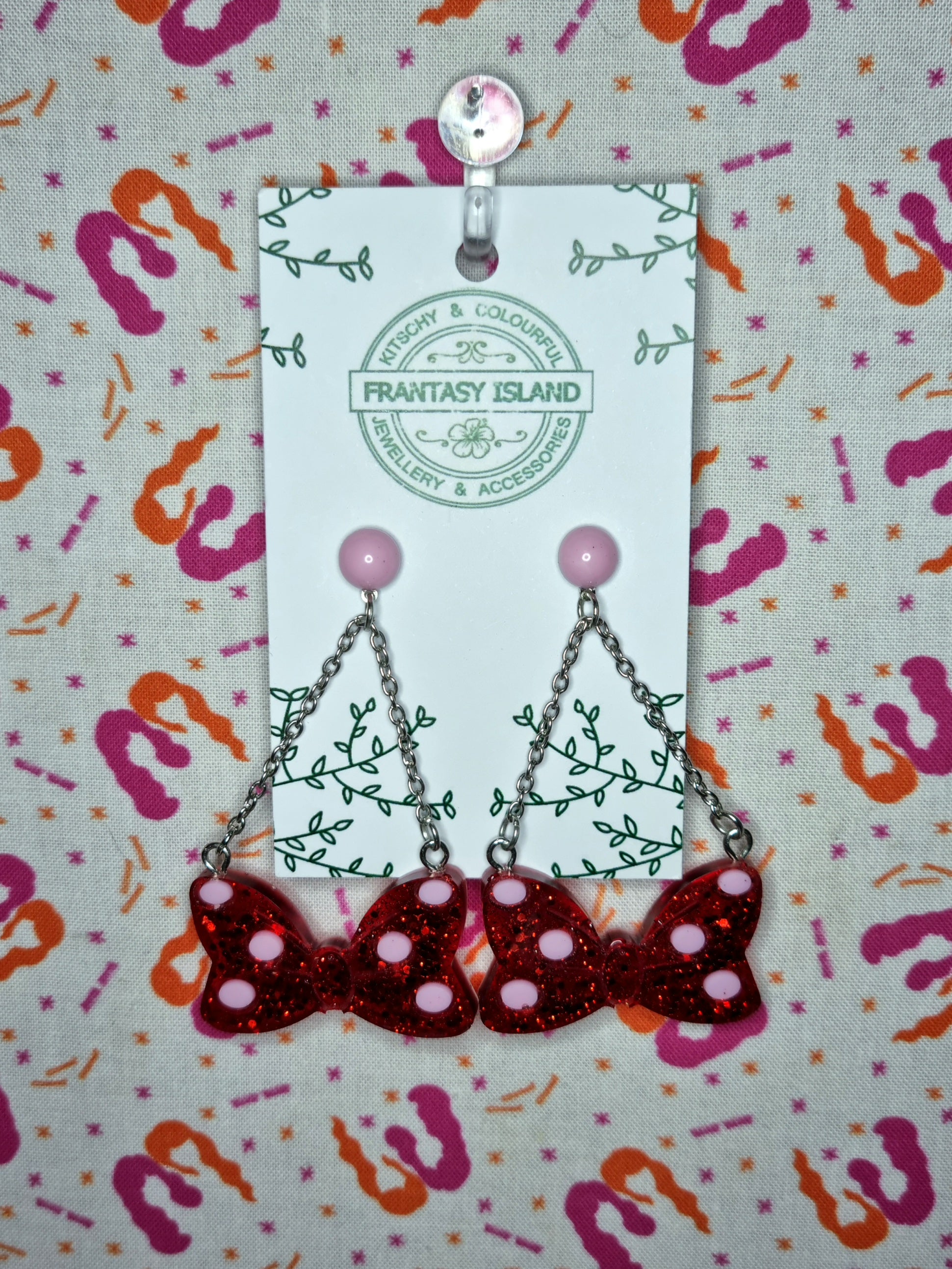 These polkadot bow drop earrings have a pastel pink and red glitter bow, hanging from silver chains and glossy pink domes - Perfect for any occasion