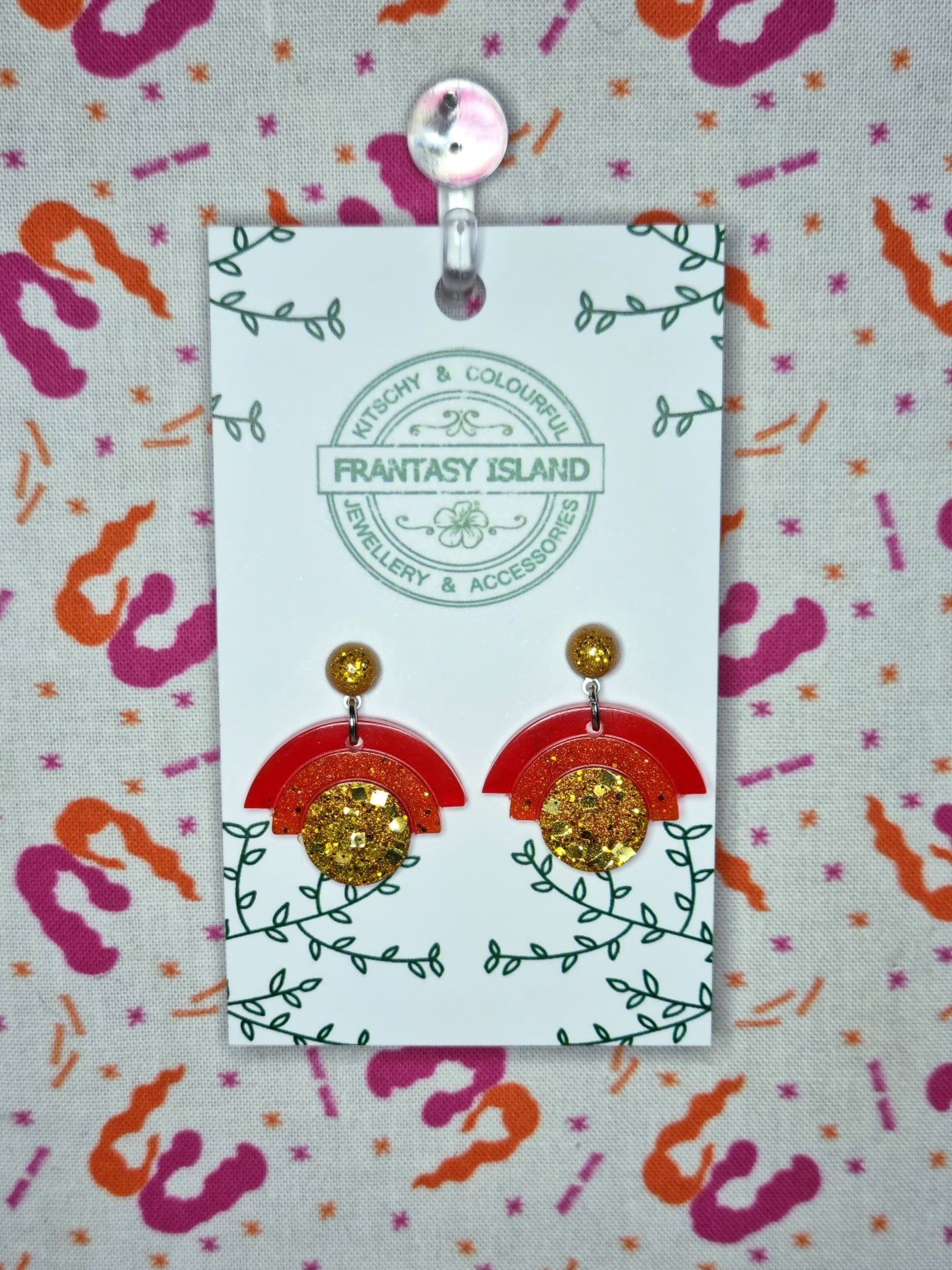 These spectacular gold sparkly drop earrings are about as glitzy as they come, with a classic retro shape and a blend of red, orange, and gold metallic pigments set in resin - Perfect for any occasion.