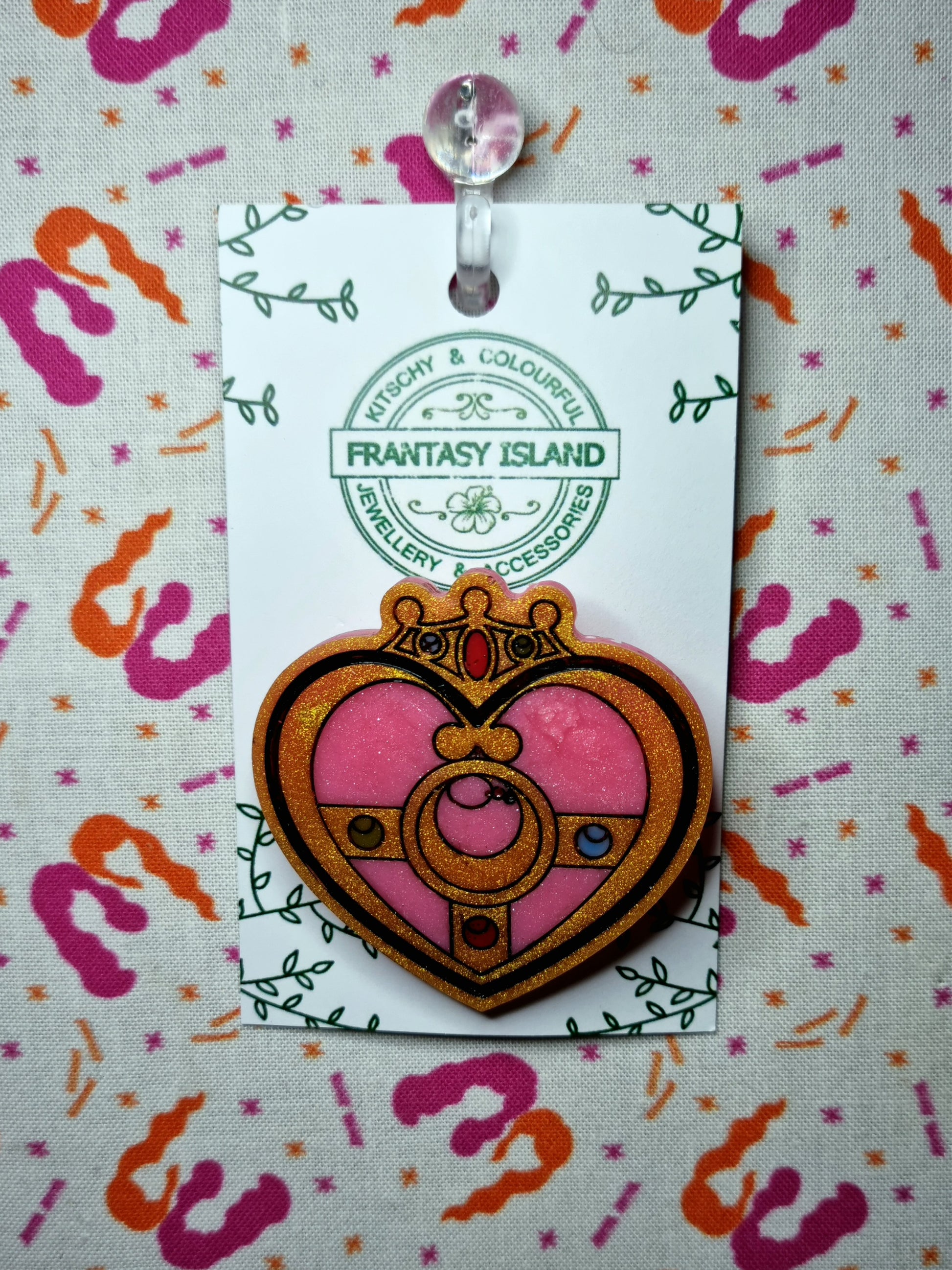 Sparkly and spectacular this Cosmic Heart Compact brooch is peak 90s anime perfection for any occasion!