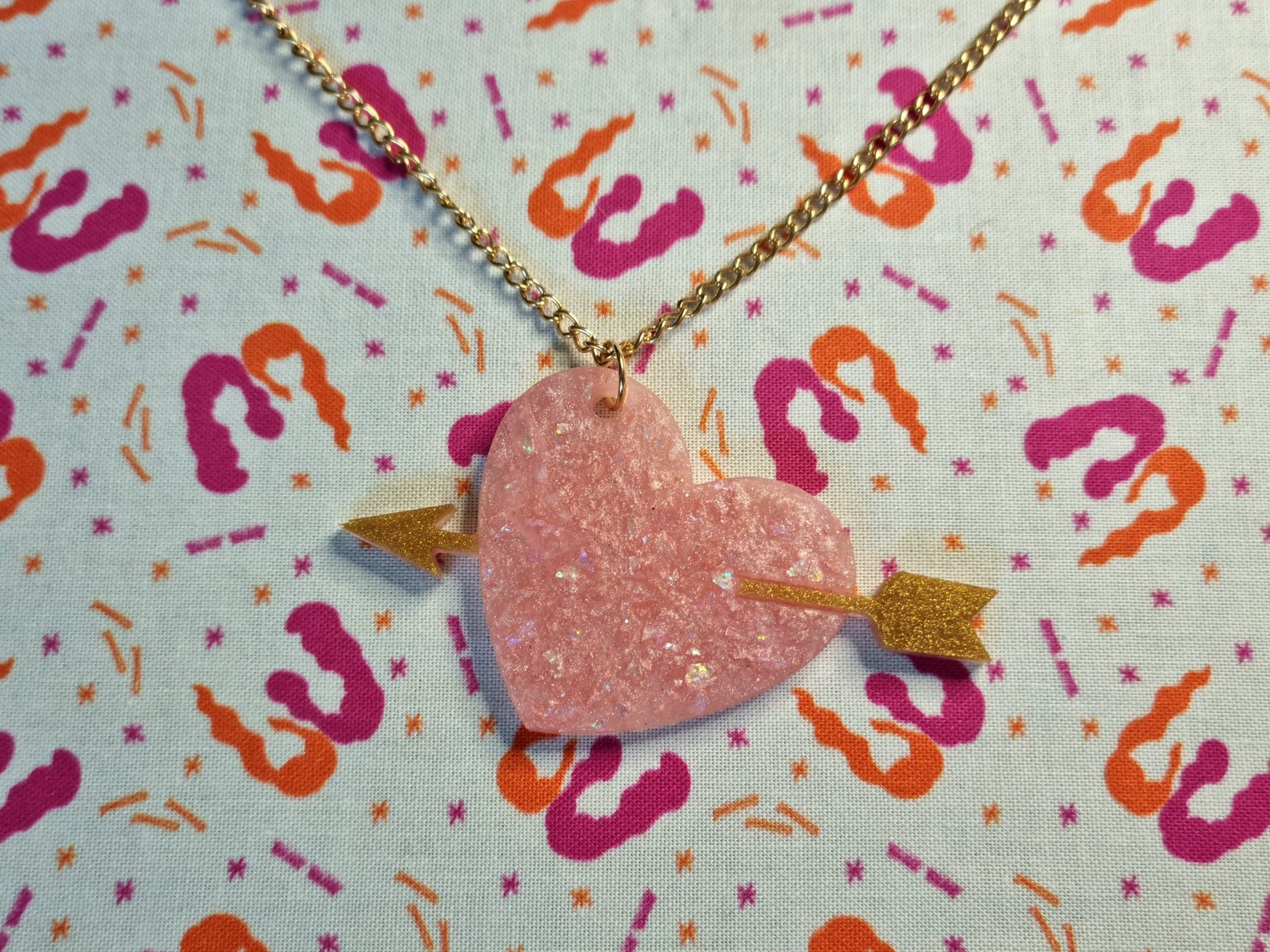 This pastel pink shiny heart necklace with gold arrow detailing is an absolute stunner, and we'll take an arrow through the heart any day for it