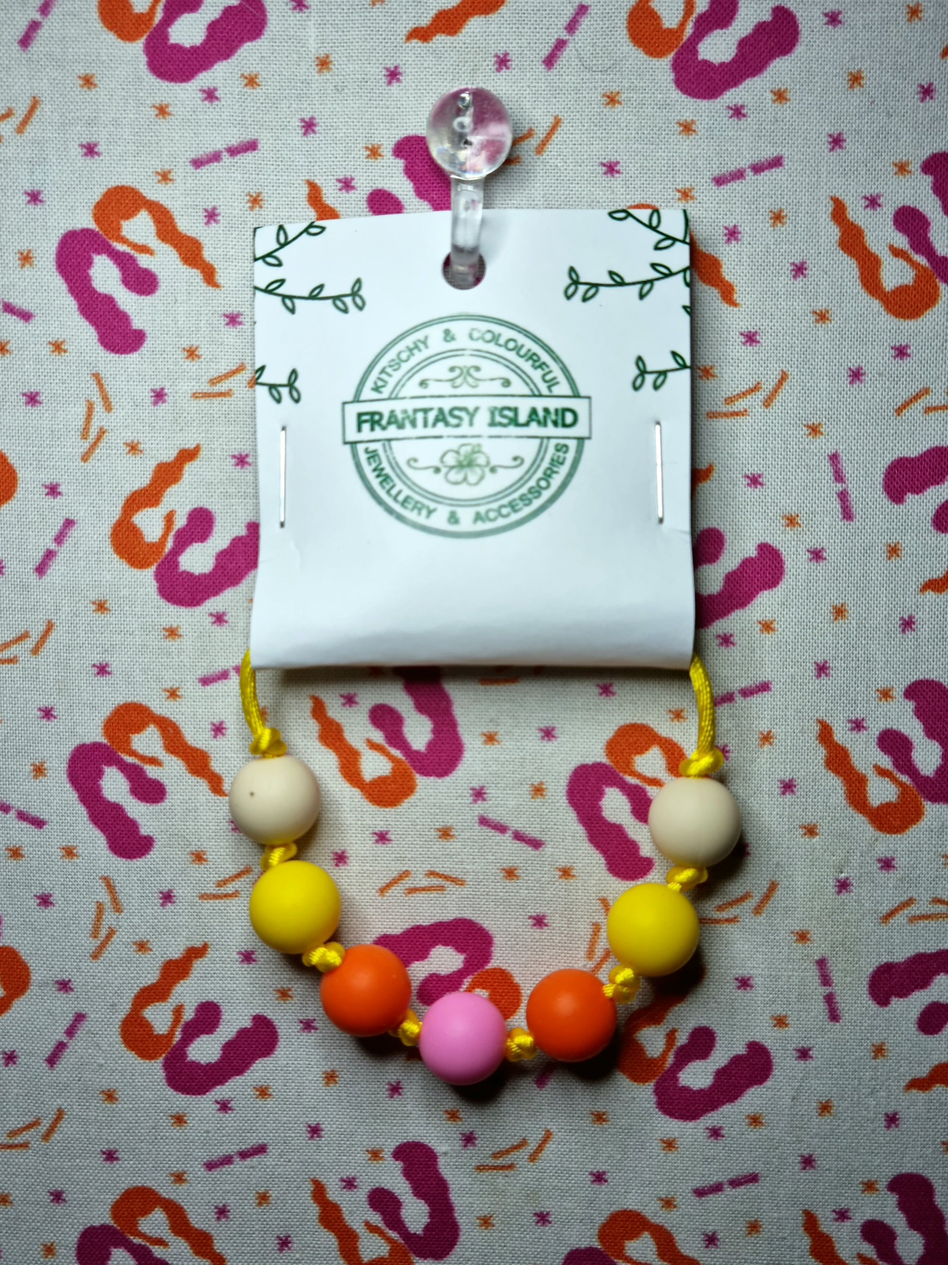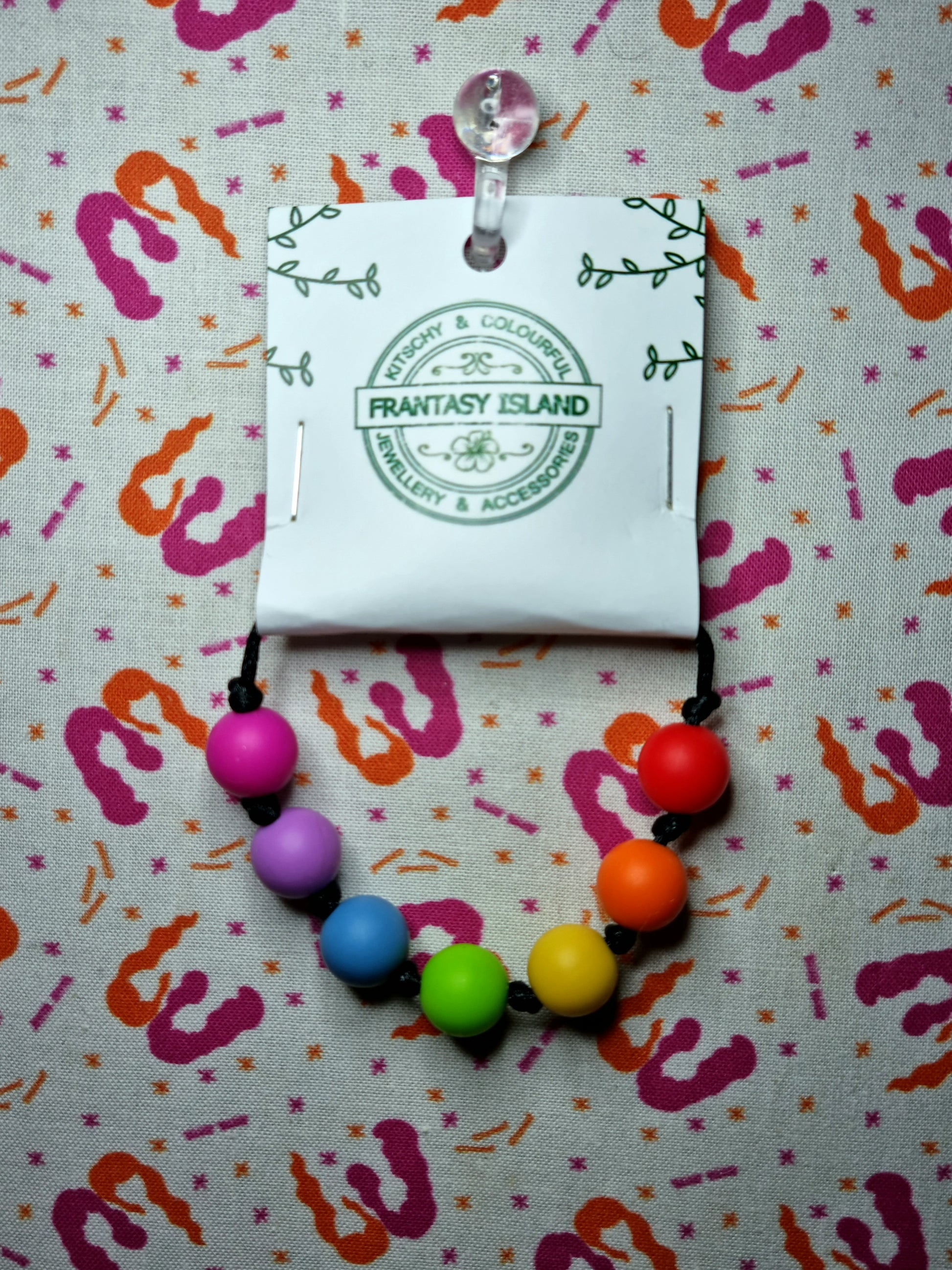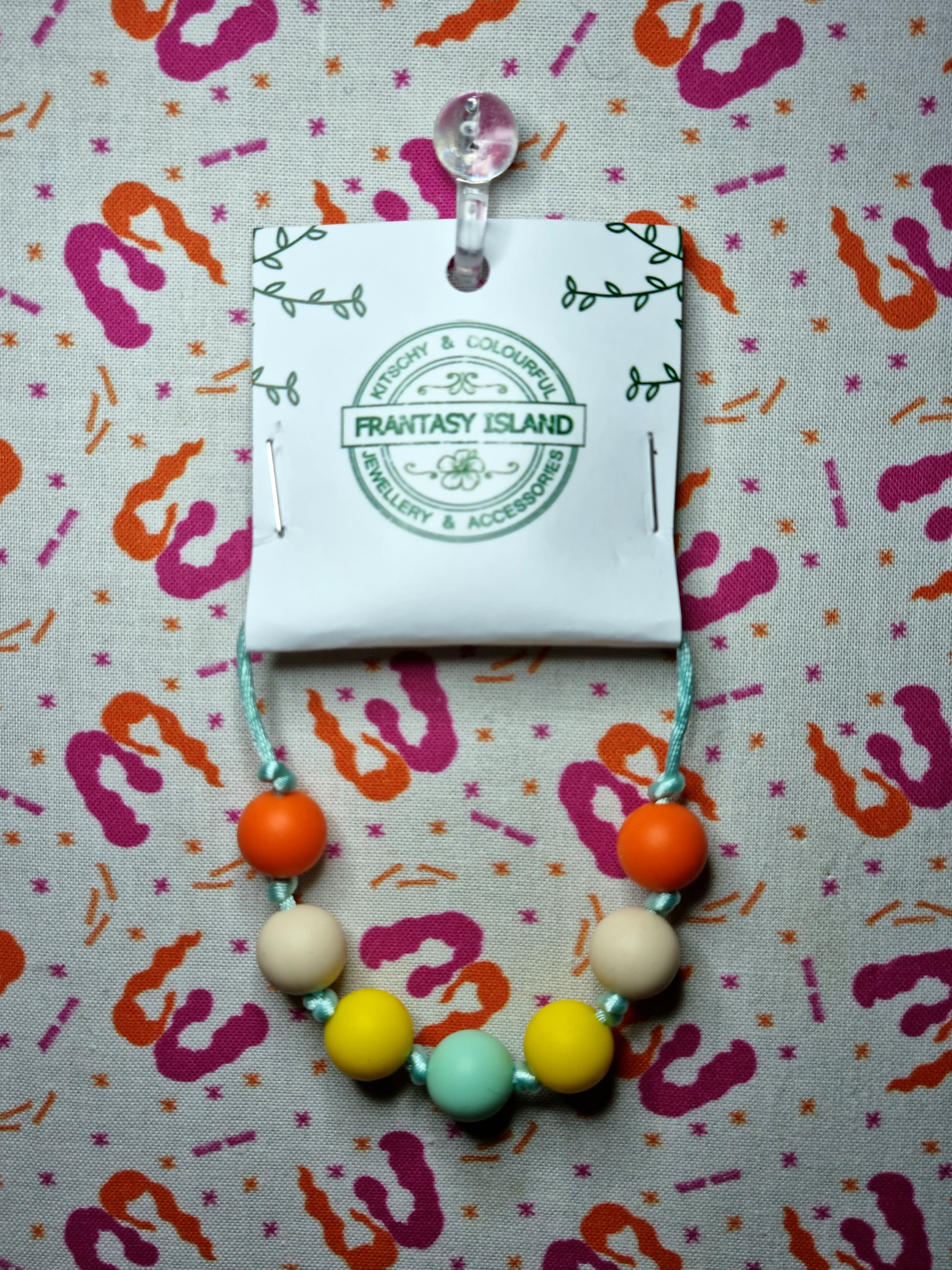 Introducing the neck-candy of your dreams! Our silicone gumball bead necklaces are the perfect accessory for any outfit, whilst also being secretly incredibly useful - The food grade silicone beads, firm breakaway clasps, and strong nylon strings ensure extra-safe wearability if you have a kiddo that just loves chewing on your jewellery while they're teething (or an excellent fidget accessory for people who can't help but chew on their hoodie strings) and they are super easy to clean in just a bit of soap and hot water. The soft touch click-together clasps house the knots for the strings so the length is easily adjustable, and each bead is securely knotted on so if the cord does happen to get chewed through the beads won't scatter to the floor.