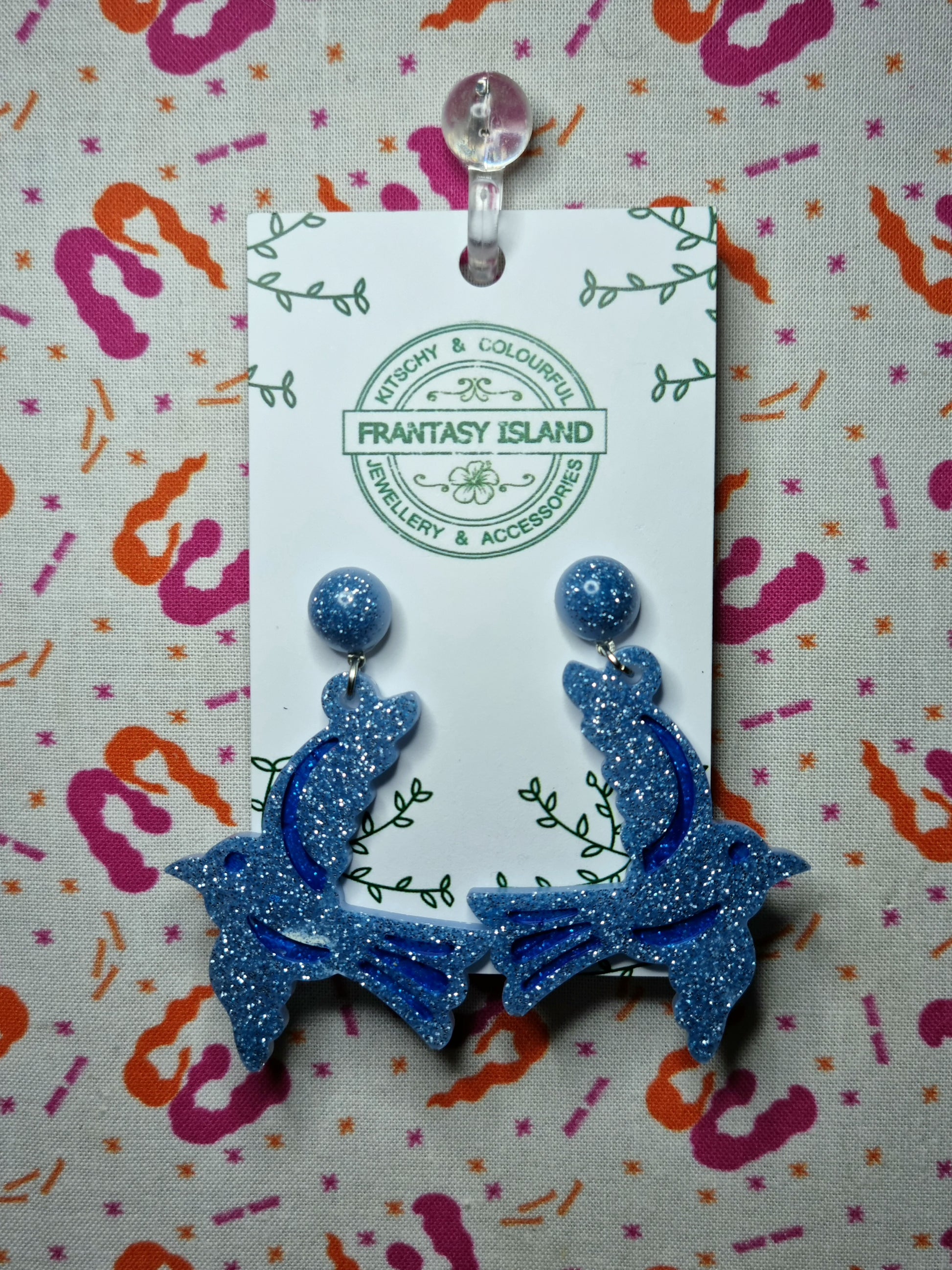 These delightful sky blue sparrow earrings are sure to take flight with your next outfit. Sparkly resin and glitter add a hint of glamour, making them the perfect accessory for any look. Swoop in on the trend and add these feathered friends to your wardrobe!