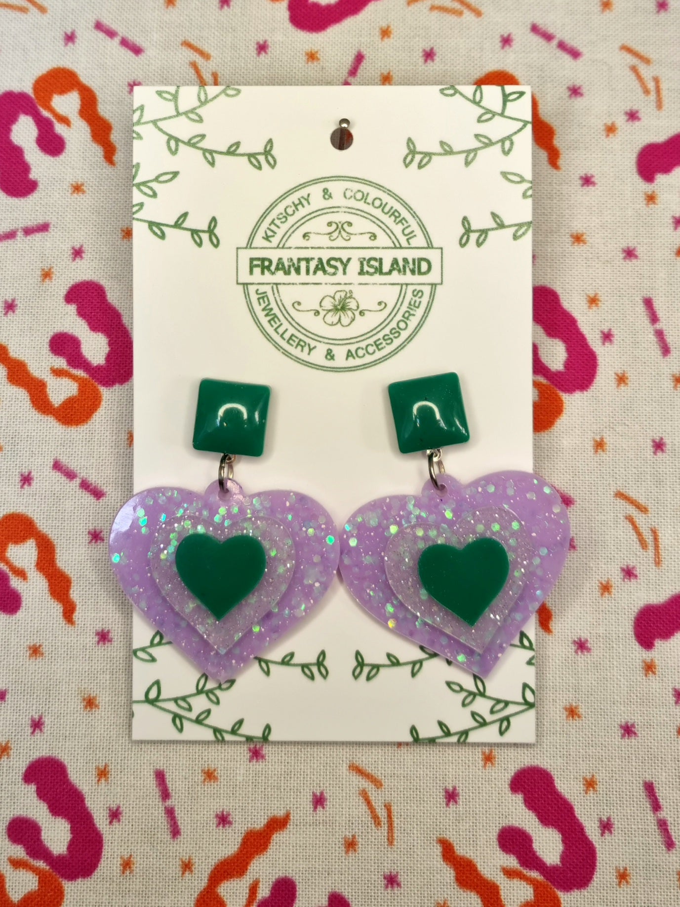 Now, we know we're good at glamorous sparkly things, but we're also really good at quirky sparkly nonsense, and these marbled lilac and green earrings are exactly that - Sparkly nonsense, perfect for any occasion