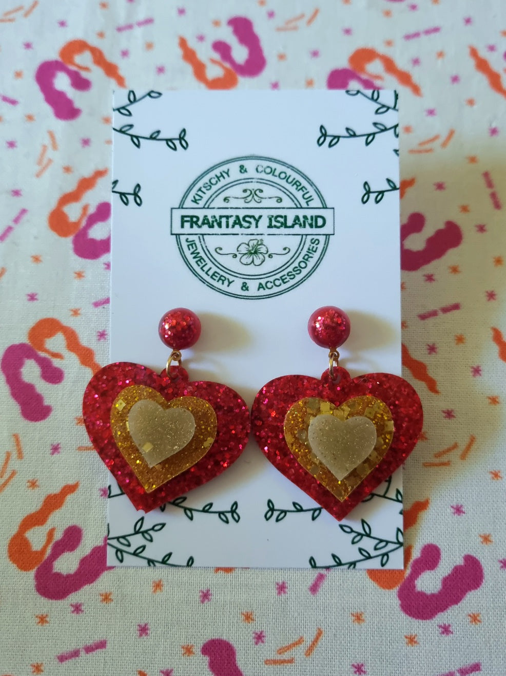 Now, we know we're good at glamorous sparkly things, but we're also really good at quirky sparkly nonsense, and these gold and red glitter earrings are exactly that - Sparkly nonsense, perfect for any occasion