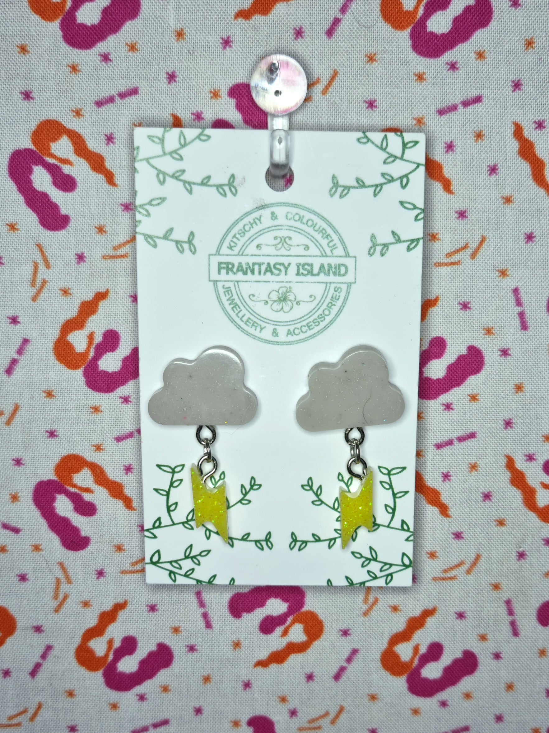 These adorable raincloud earrings have an exaggerated cloud and lightning bolt shape, with iridescent glitter in shimmery resin - Perfect for any occasion.