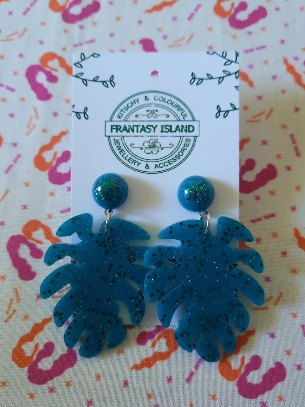 These fresh sparkly monstera leaf earrings have a blend of glitters set in a teal blue resin - Perfect for any occasion.