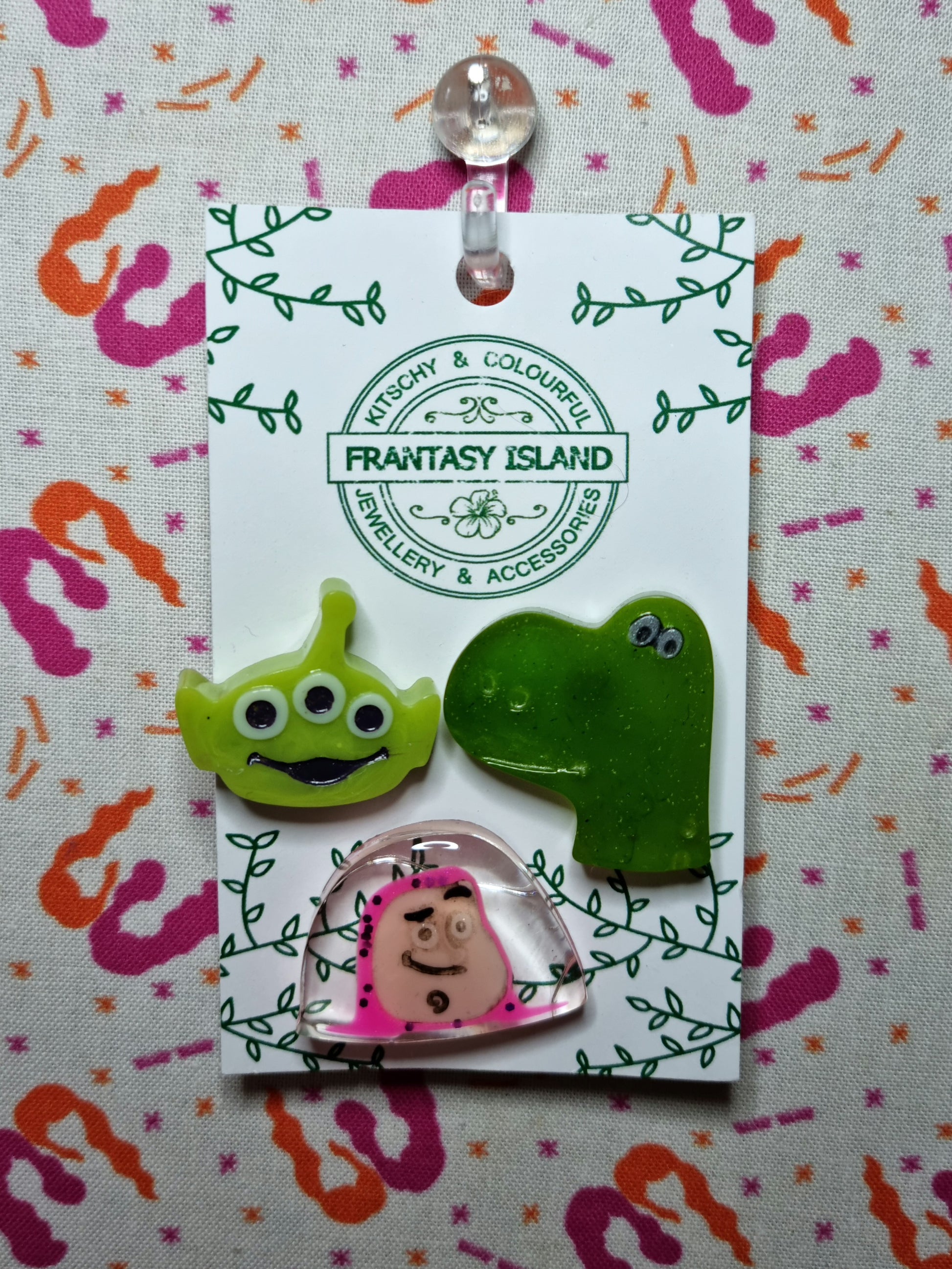 You don't need to be in Andy's room to bring the fun of Toy Story to your day! Add some nostalgia to your wardrobe with this Toy Story Pin Trio, featuring Rex, Buzz and the Green Alien. Who says it's only kids who can have all the fun?