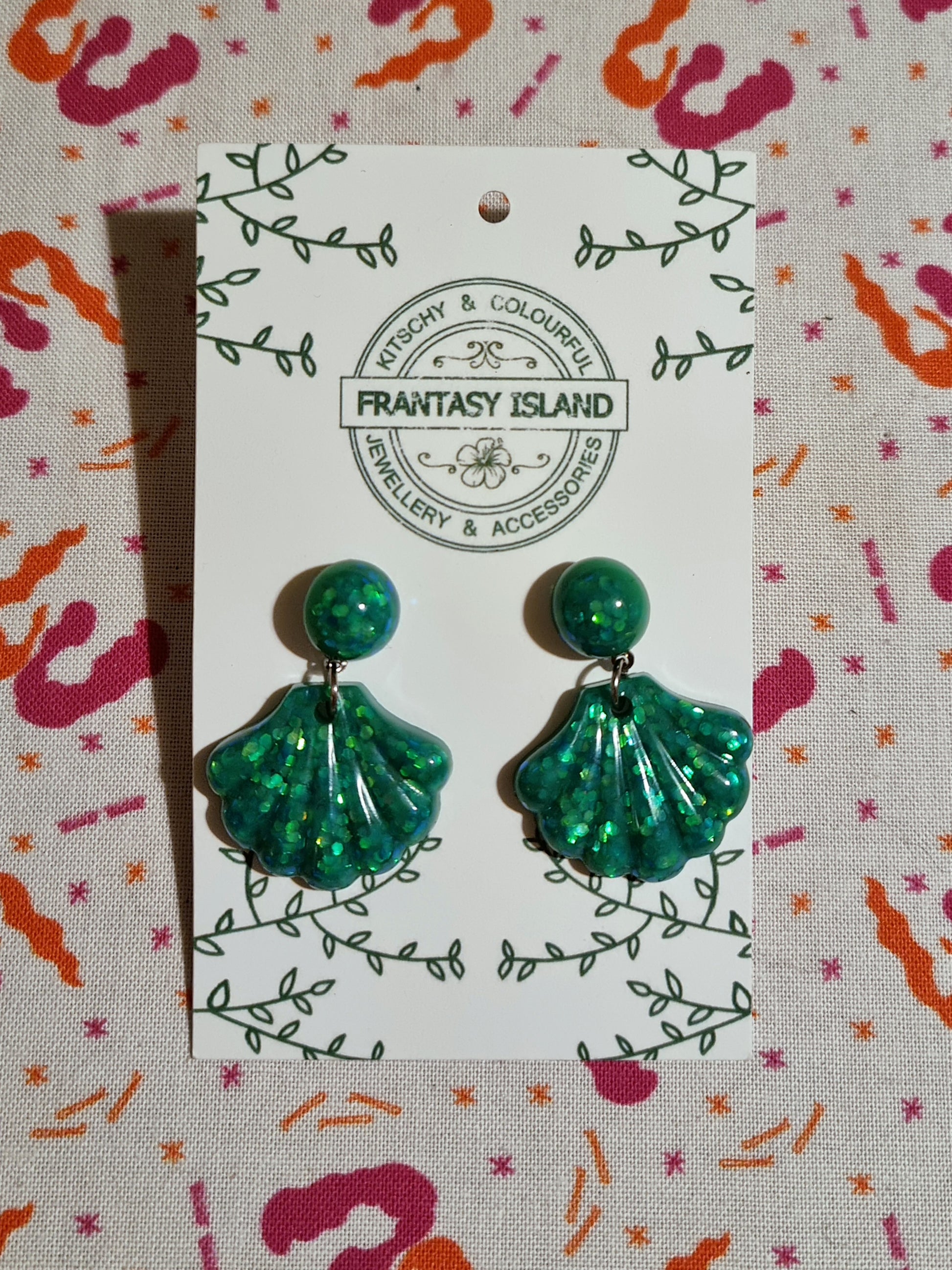 These glossy green baroque shell earrings have a classic retro shape, with soft shimmering pigments and holographic glitter set in a bright turquoise resin - Perfect for any occasion.