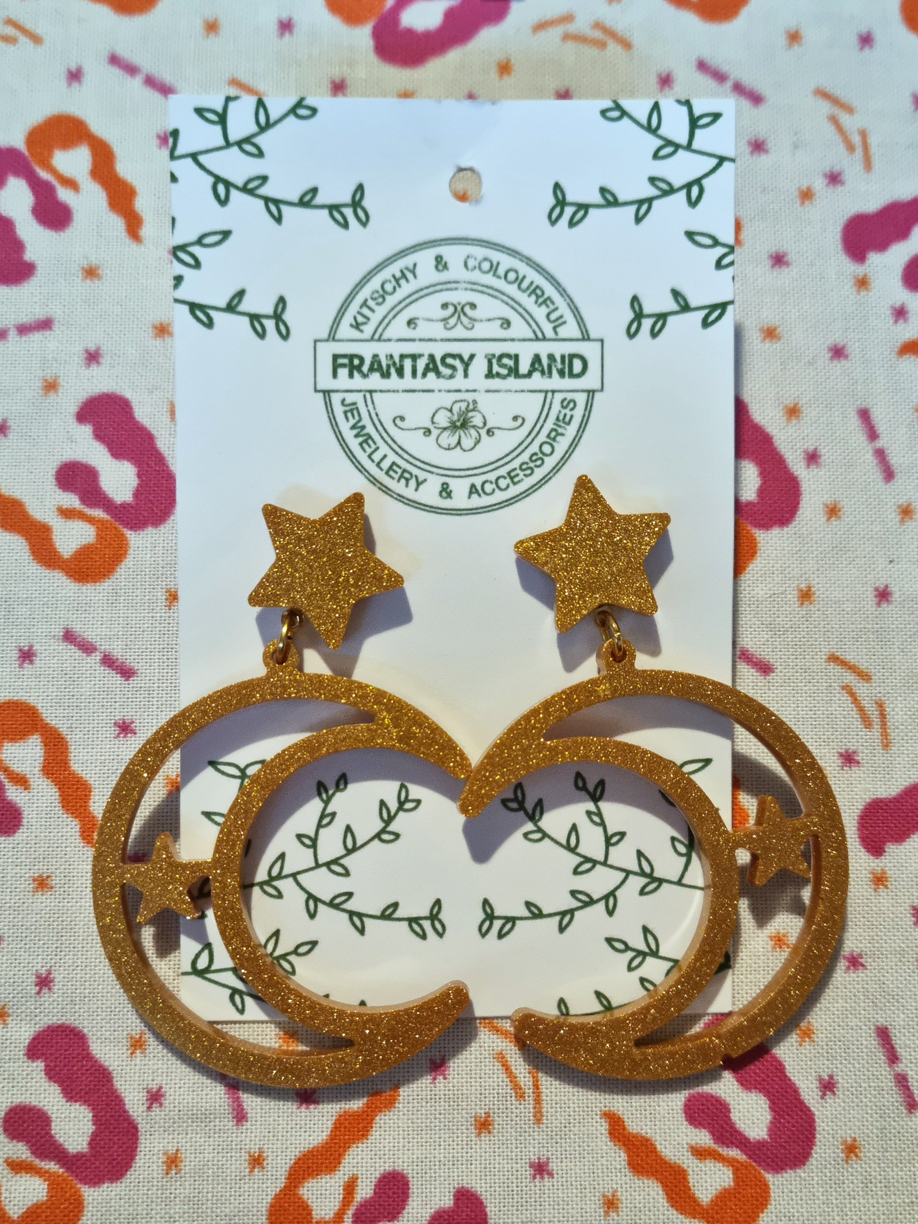 These spectacular warm gold star and moon earrings are about as glitzy as they come, with a blend of gold shimmering pigments set in metallic gold resin - Perfect for any occasion.