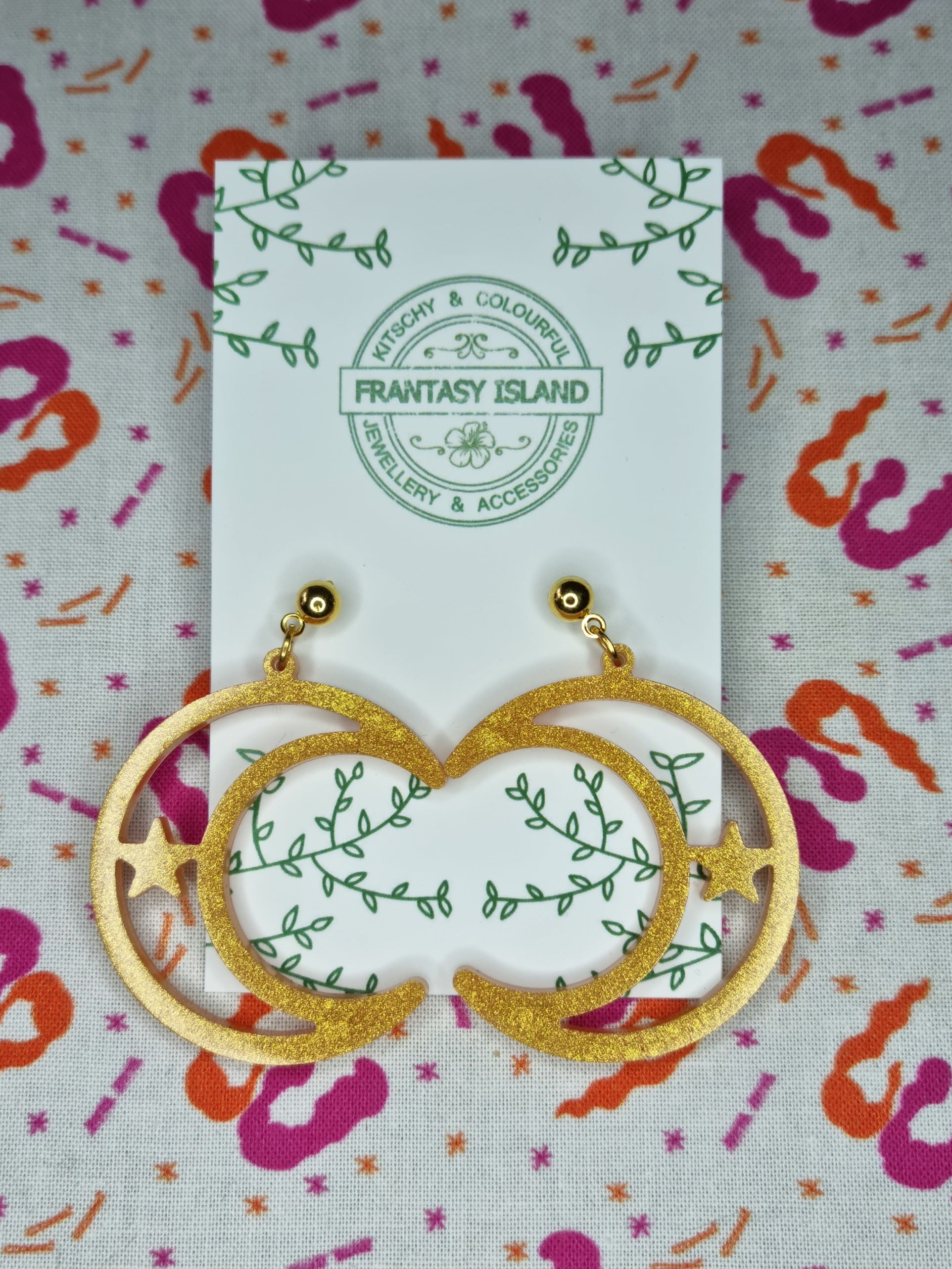 These spectacular warm gold star and moon earrings are about as glitzy as they come, with a blend of gold shimmering pigments set in metallic gold resin - Perfect for any occasion.