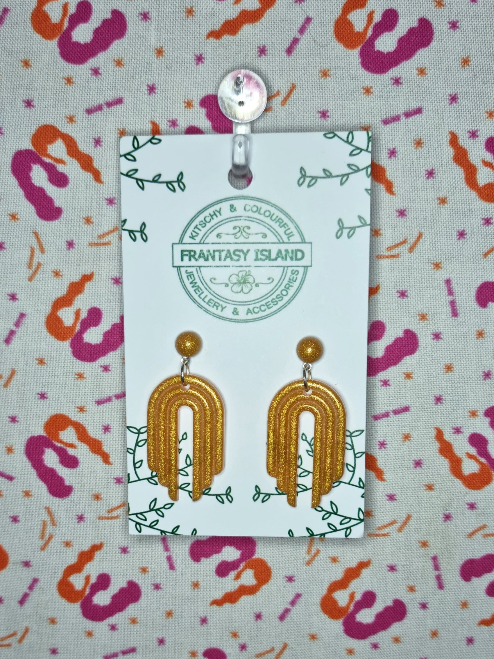 These spectacular deep antique gold arch drop earrings are about as glitzy as they come, with a classic retro shape and a blend of gold glitters set in a warm metallic mustard resin - Perfect for any occasion.