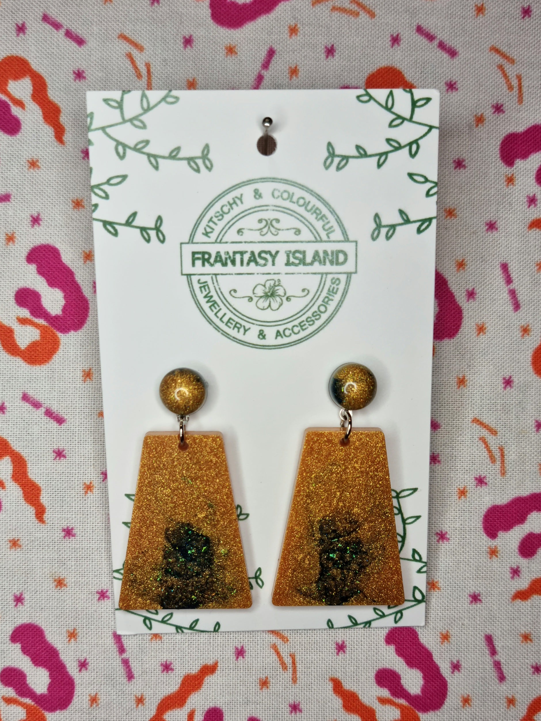 These spectacular warm gold rectangular drop earrings are about as glitzy as they come, with a classic retro shape and a blend of gold glitters set in a soft metallic gold resin and deep green glitters in black resin - Perfect for any occasion.