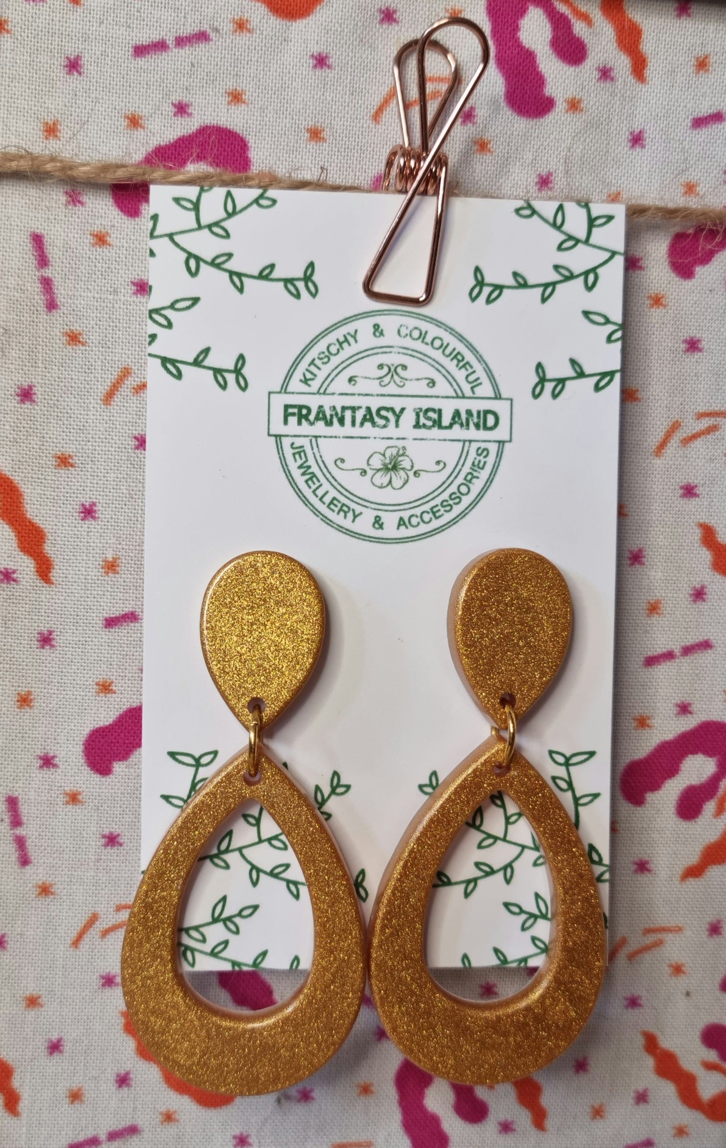 These warm gold metallic hoop earrings have a classic retro shape, with soft shimmering gold pigments set in resin, for a more subtle but no less sparkly look - Perfect for any occasion.