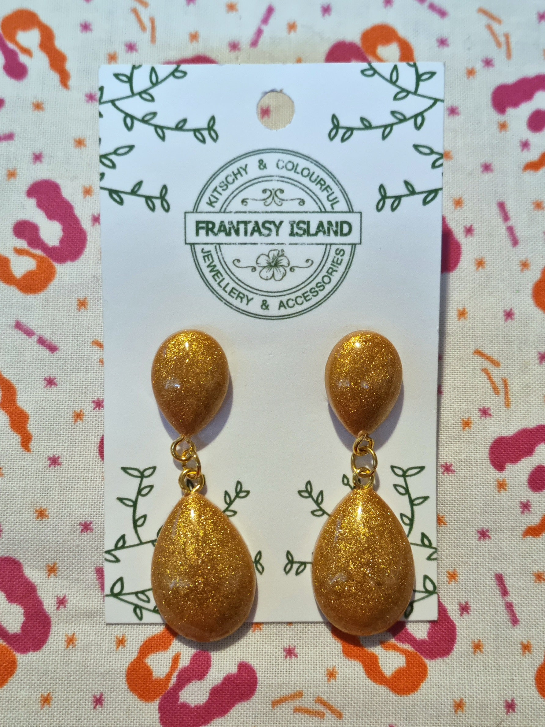 These warm gold metallic hoop earrings have a classic retro shape, with soft shimmering gold pigments set in resin, for a more subtle but no less sparkly look - Perfect for any occasion.