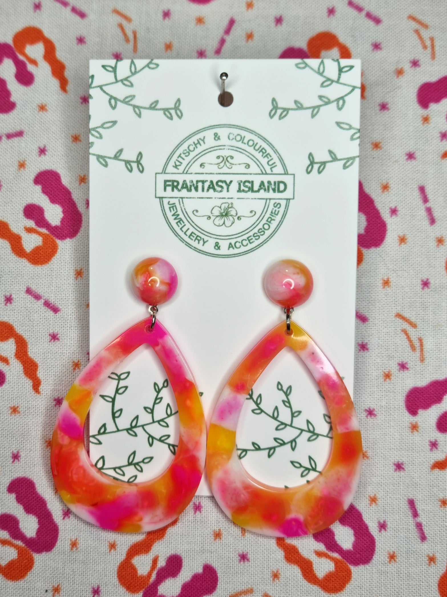 These funky multicoloured tortoiseshell teardrop earrings have a classic retro shape, with swirls of pink, yellow, and bright orange resin - Perfect for any occasion.