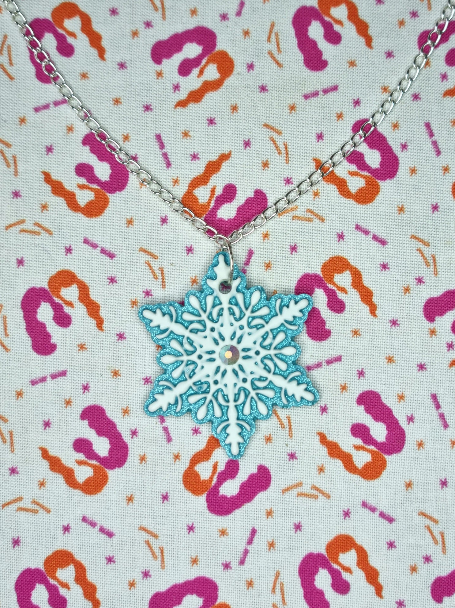 This soft blue and white snowflake pendant with rhinestone detail is a perfect match for our 'Winter Wonderland' earring collection - Perfect for any occasion.