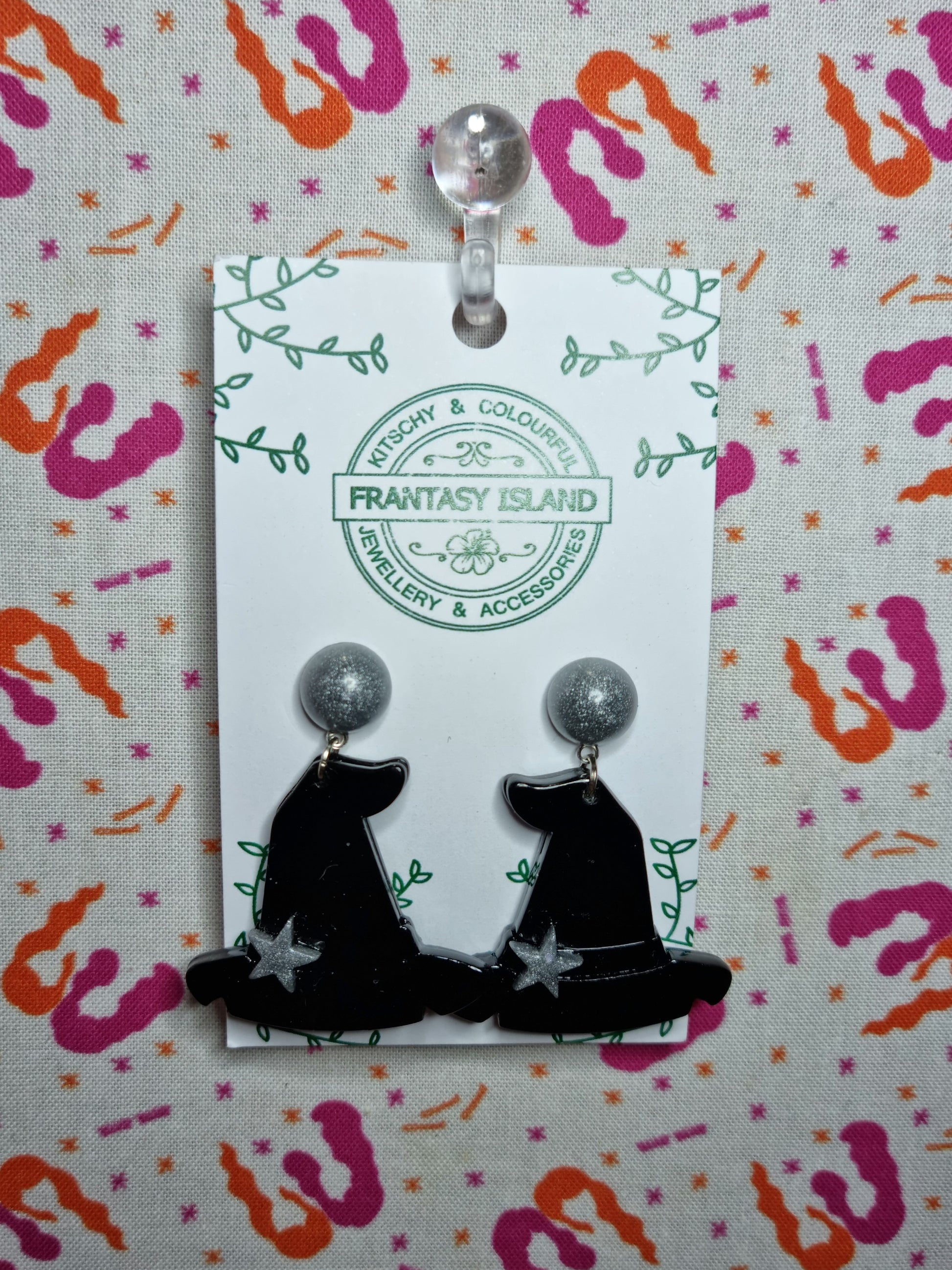 Put a sparkle in your hex-factor with these witchy Witch Hat Earrings! Featuring a glossy black hat with silver star detail, these earrings are perfect for adding some mischievous magic to any outfit.