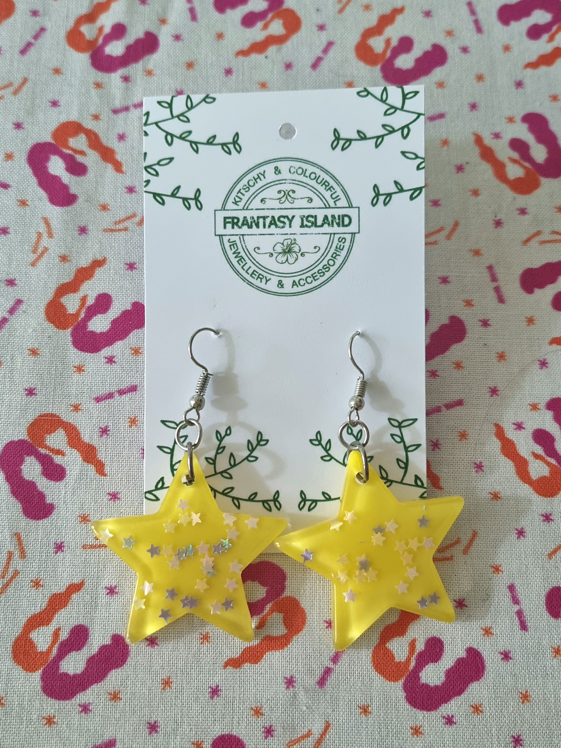 These spectacular earrings are about as glitzy as they come, with a fun star shape and a blend of holographic star confetti set in buttery yellow resin - Perfect for any occasion.