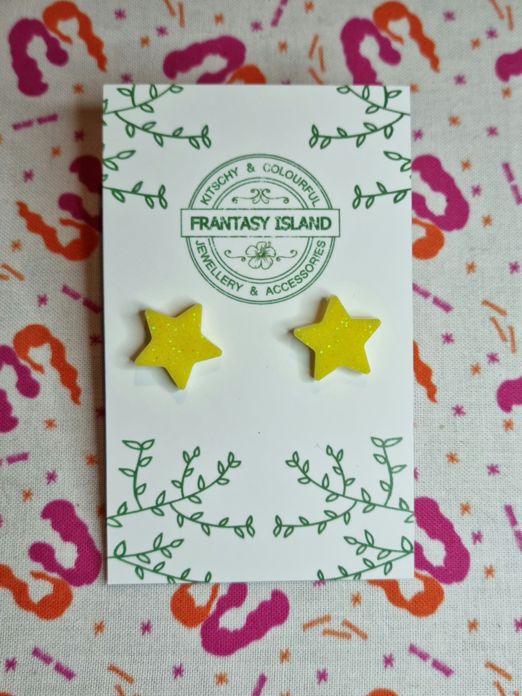 These spectacular warm gold mini-drop earrings are about as glitzy as they come, with a fun star shape in a blend of gold shimmering pigments set in metallic gold resin - Perfect for any occasion.